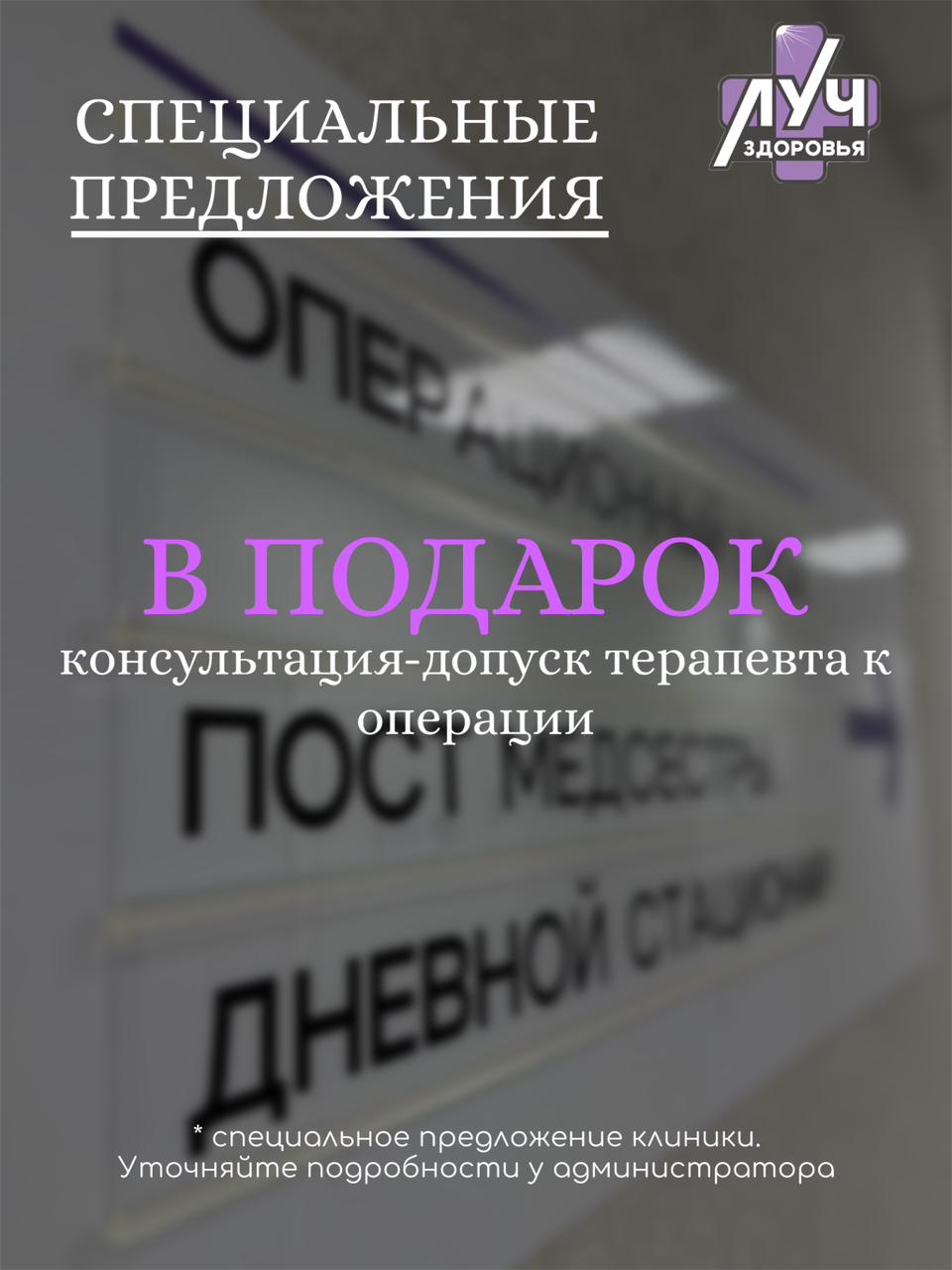 В сети клиник "Луч Здоровья" до конца апреля 2026 года действует спецпредложение - консультация-допуск терапевта к операции в подарок.