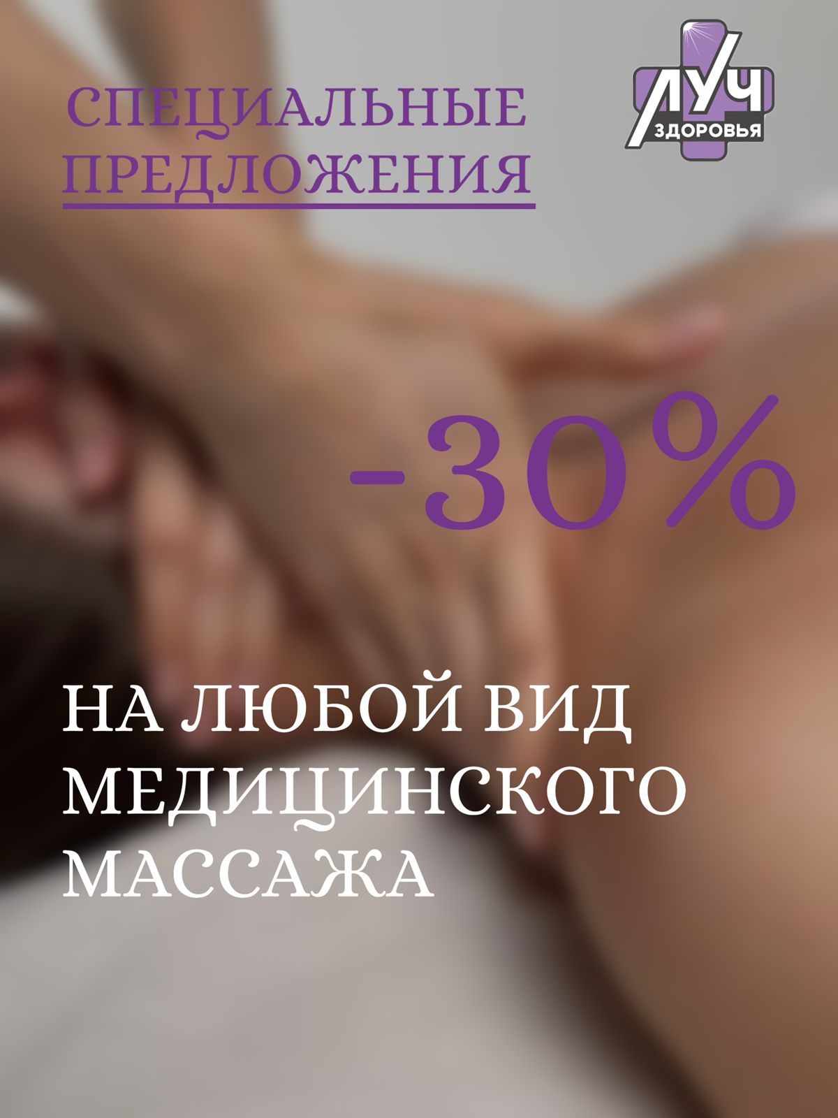 В сети клиник "Луч Здоровья" до конца апреля 2026 года действует скидка 30% на все виды медицинского массажа.